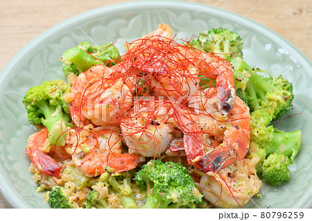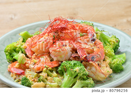 海老マヨ。エビのマヨネーズ炒め。ブロッコリーと玉ねぎみじん切り入り。海老はブラックタイガー使用。
