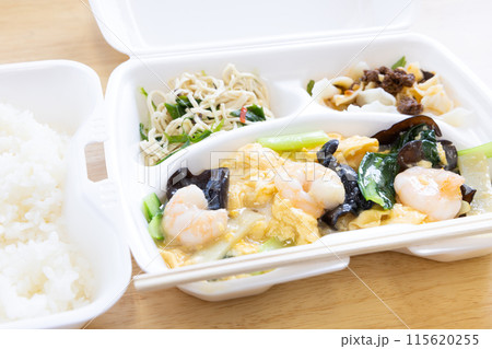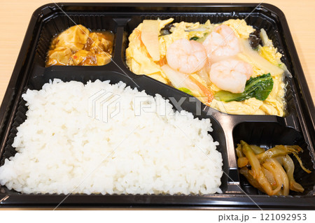 美味しい海老と青菜と卵の塩炒め中華料理弁当