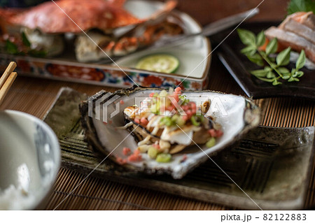 ガスグリルで焼いた岩ガキとエビ バーベキューイメージ
