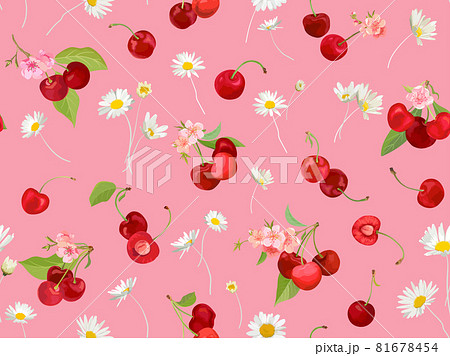 Seamless cherry pattern with summer berries, fruits, leaves, flowers background