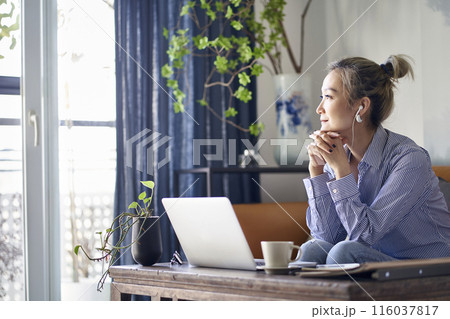 mature asian woman working from home using notebook computer