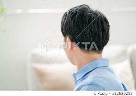 Tired strained man suffering from neck pain while working at computer. Male touchingly massages neck, puts on neck collar, sitting on couch, suffering from discomfort, long hours sedentary overwork