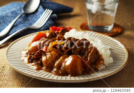 ほかほかと香り立つトマトカレーと白ごはんの盛り付け サラダ付き家庭料理の食卓イメージ