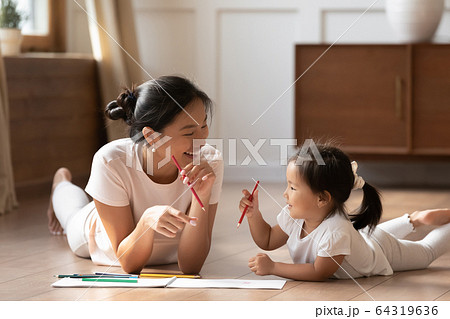 Asian mother and daughter lying on floor draw with pencils
