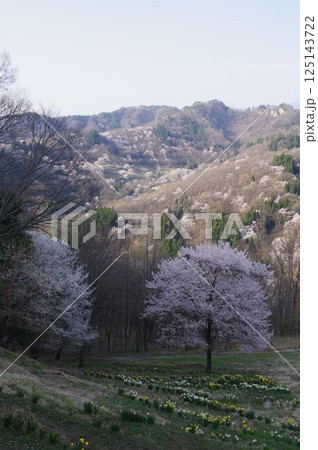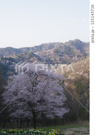 陸郷二本松の満開の桜と残雪の北アルプス 長野県池田町