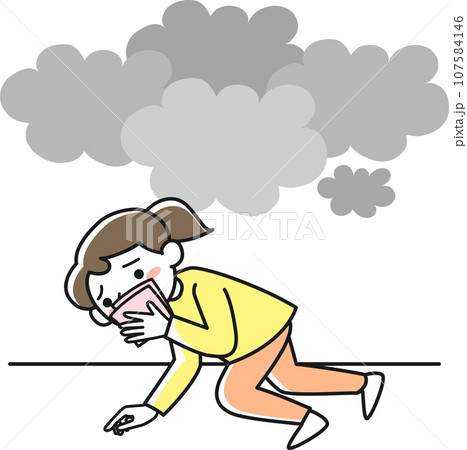 火災時に口と鼻を覆って低い姿勢で避難する若い女性