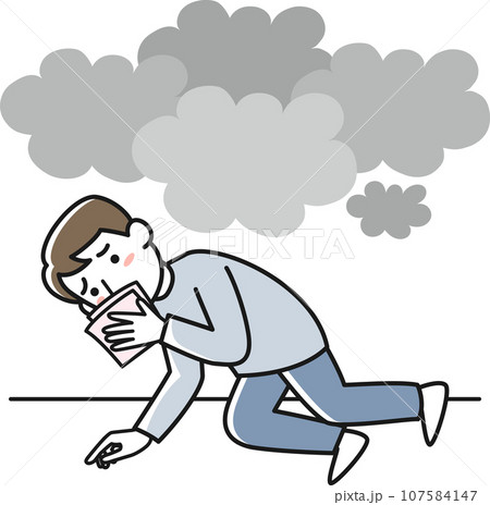 火災時に口と鼻を覆って低い姿勢で避難する若い男性