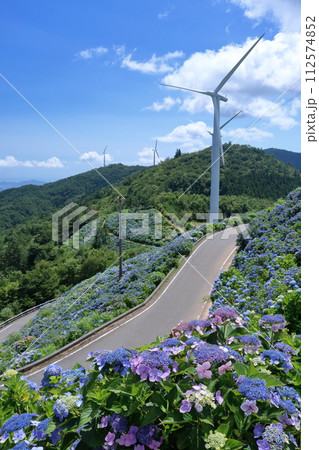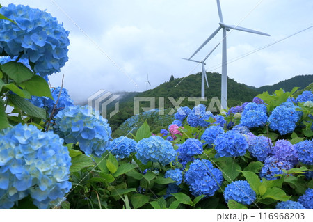 高原を彩るアジサイと風車 (徳島県 大川原高原)