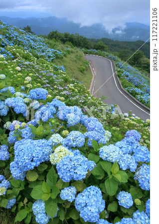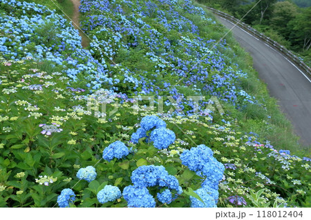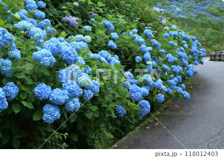 大川原高原 道路沿いを彩るブルーのアジサイ (徳島県 佐那河内村)