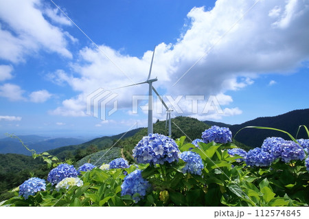 高原に咲くアジサイと風車 (徳島県 大川原高原)