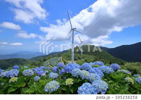 大川原高原 青い紫陽花と風車 (徳島県 佐那河内村)