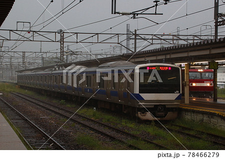 ゲリラ豪雨の黒磯駅に停車中の東北本線E531系(黒磯⇔新白河:ワンマン運転)