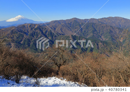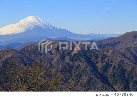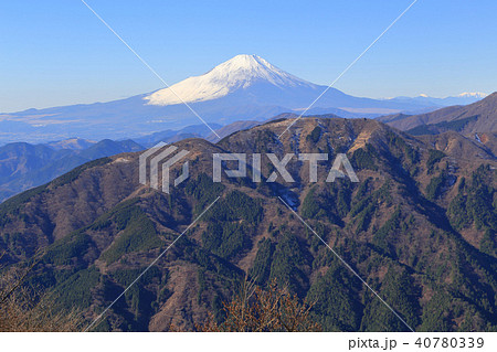 秋の神奈川県伊勢原市の大山山頂からから西側の富士山、二ノ塔、三ノ塔方面
