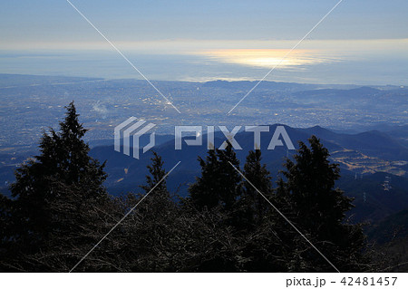 冬の大山(おおやま)山頂から朝の相模湾、江ノ島、高麗山方面を見下ろす