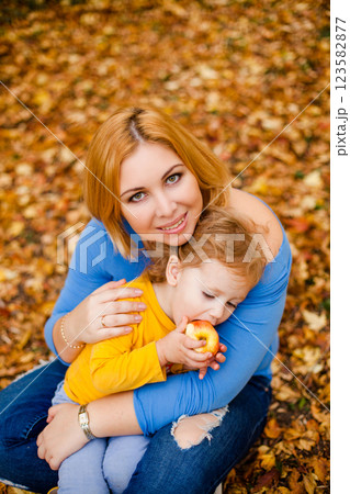 Stylish mother and daughter enjoy the autumn park. Family on a walk. Childhood, walks, rest.