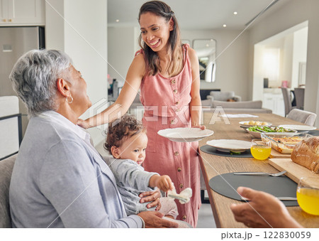 Mom, baby and grandmother eating at table, bonding and sharing food and love at home. Happy, smile and relax women bonding while having a meal, enjoying family time and being loving and caring