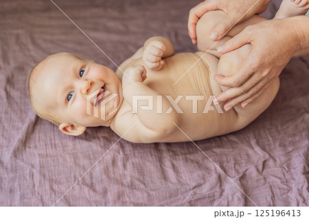 Newborn baby lying on a soft blanket while mother gently exercises the babys tiny limbs. Early development, bonding, and baby care concept