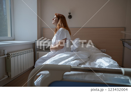 An unhappy woman sits on a couch and holds her stomach in a hospital room after giving birth.