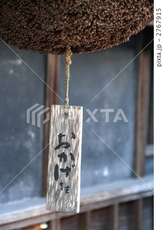 古い町並みにゆれる風鈴(短冊に「今日無事」の文字)