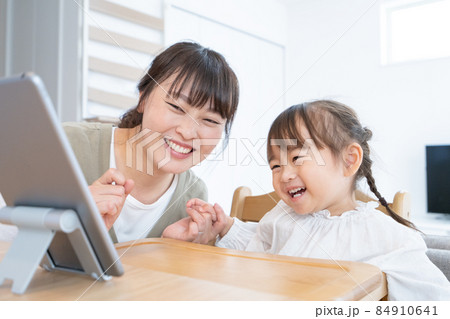 自宅のダイニングでママと一緒にタブレットを見る2歳の女の子