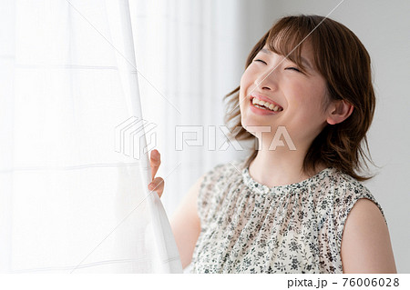 朝カーテンをあけながら笑う若い女性