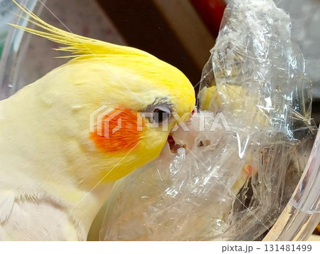 ラップを噛んで遊ぶ手乗りのオカメインコ