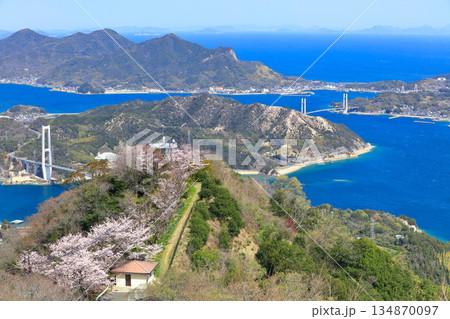 【愛媛県】桜咲く積善山から見た ゆめしま海道(岩城橋と生名橋)