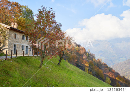View on house on the mountain side, picturesque Alps autumn landscape, mountain hills in Lombardy, Italy. Tourist adventure