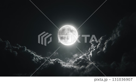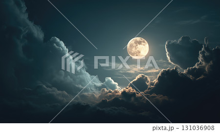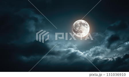 Glowing full moon in dark night sky with clouds