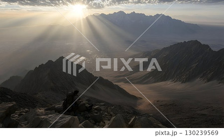 Hiker silhouetted against sunbeams over vast mountain valley, a
