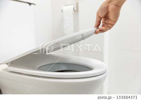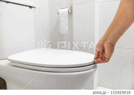Cropped image of young woman cleaning Toilet seat by a wet wipe in public restroom