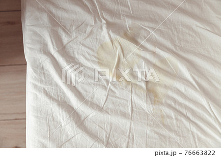Image of pee's child on the white bed sheet. Cause stains and dirty on the mattress.