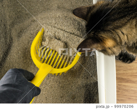 Isolated image showcases a cat in a litter box underscoring the significance of animal care and hygiene. The designated cat tray serves as the feline's toilet in this clean controlled environment.