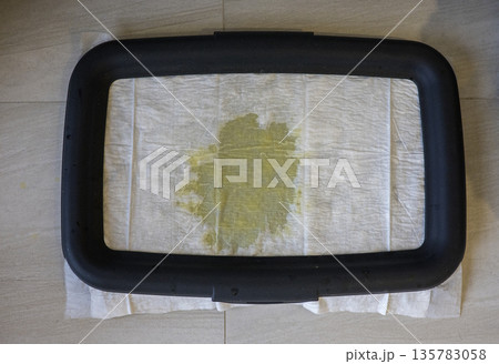 ペットシーツに犬の尿跡。室内トイレトレーニングの様子。