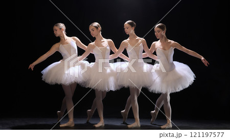 Four elegant and graceful girls, ballet dancer and classical tutus making artistic performance on dark lit stage against black background