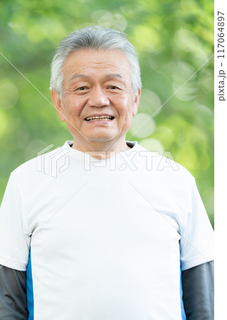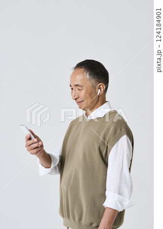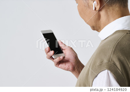 スマートフォンで音楽を聴く私服姿のシニア男性