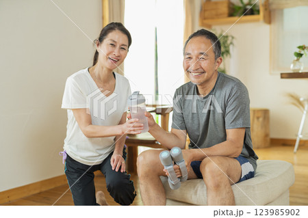 公園で車椅子に乗って散歩する高齢者夫婦(シニア・男女)