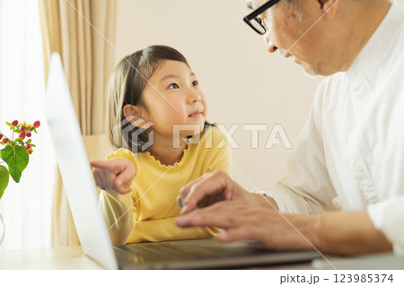 家でタブレットを一緒に楽しむ孫と老眼でよく見えない祖母