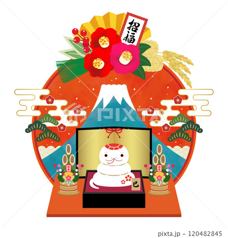 2025年 巳年 年賀状素材 へびの正月飾りの和風イラスト【招福】 木札付