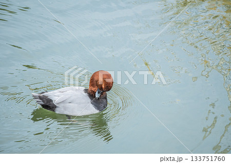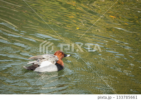 水に浮かびながら羽づくろいするホシハジロ(オス)