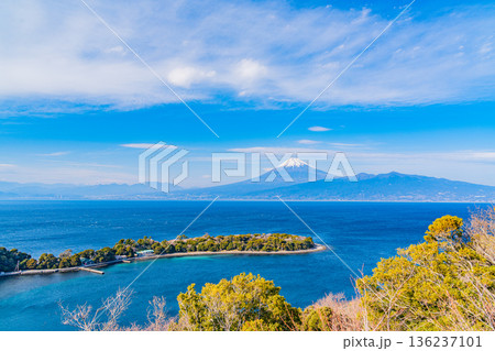 空撮 静岡県・西伊豆から眺める大瀬崎と富士山 冬