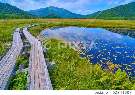 夏の福島県の尾瀬 下田代(沼尻川)付近から燧ヶ岳方面方面の眺望