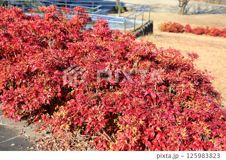 冬の公園 紅葉オタフクナンテンの生垣