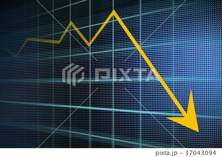 Flag with a declining bar chart and down arrows, symbolizing decline in data, performance, or various national indicators in the country.
