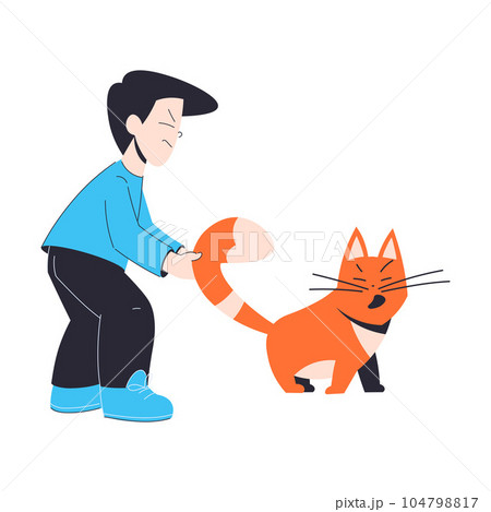 Naughty Boy Pull Cat Tail Have Bad Behaviour Vector Illustration