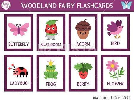Vector fairyland flash cards set with butterfly, acorn, berry, bird. English language game for kid. Magic woods flashcards. Fairytale forest nature educational printable worksheet with animals