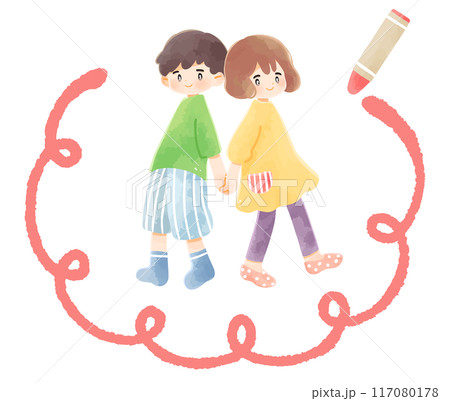 木の下で手を繋いでいる男の子と女の子のイラスト