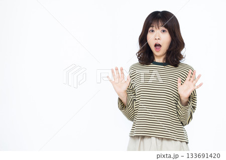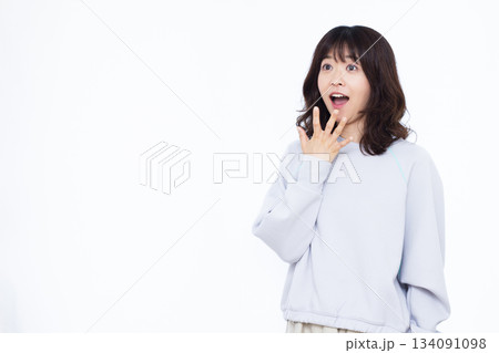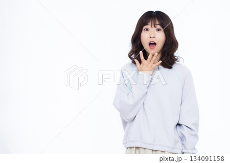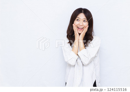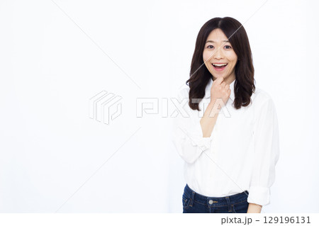 白い背景の前で笑顔で笑顔でびっくりしている30代の女性