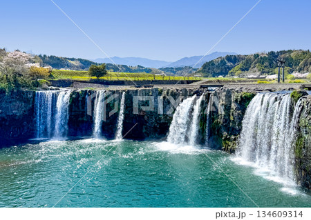 満開の桜と原尻の滝