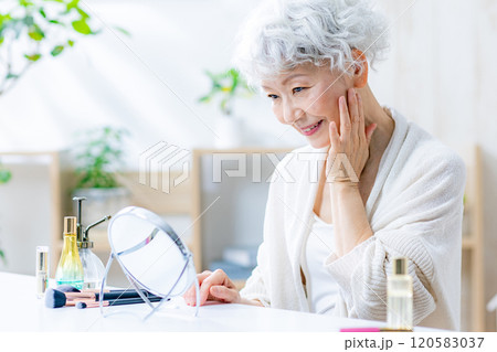 カメラ目線でサムアップする笑顔のグレイヘアのシニア女性